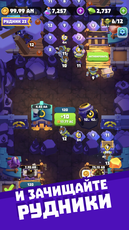 Каждый из гоблинов имеет определенный уровень, который позволяет им добывать больше или меньше ресурсов. Если одинаковых по уровню зеленокожих объединить, то можно получить более трудолюбивого и работоспособного персонажа. После того как на участке будут собраны все ископаемые, можно будет отправляться на новый. Заработанные средства можно потратить на найм новых шахтеров, прокачку подземелья и модернизацию пушек. Взломанная версия открывает доступ к увеличению наград, а также отключает надоедливую рекламу.