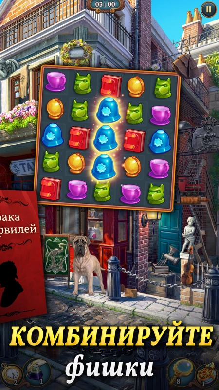 Sherlock: Поиск предметов – занимательная волшебная головоломка в механике три в ряд, где игрокам предстоит помочь всемирно известному детективу раскрывать самые запутанные дела.
