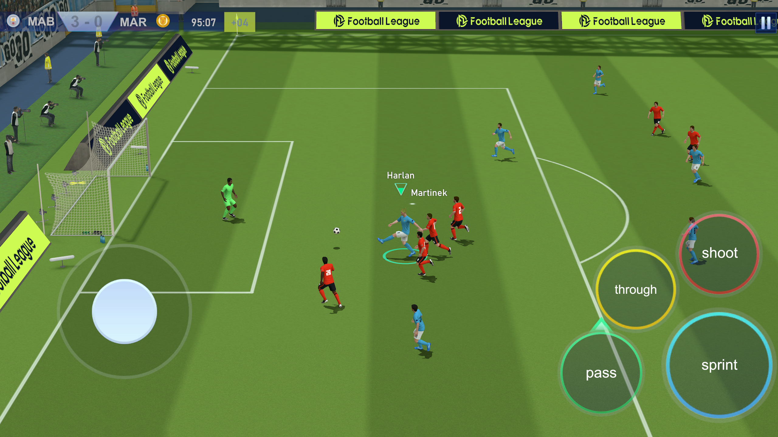 Начинается геймплей с выбора любимой футбольной команды, за которую предстоит играть и завоевывать различные награды. Для этого нужно будет выходить на поле и соревноваться с другими командами, при этом можно самостоятельно выбирать продолжительность матча от трех до шести минут. Управление достаточно понятное и комфортное, когда мяч будет у одного из членов команды, то с помощью виртуального джойстика с левой части экрана можно будет передвигаться по полю. В то же время с правой стороны экрана будут расположены кнопки для бега, ближнего и дальнего паса, и удара по воротам. Когда мяч будет у соперников, нужно будет стараться перехватить мяч делая подкаты и защищаться от нападения.