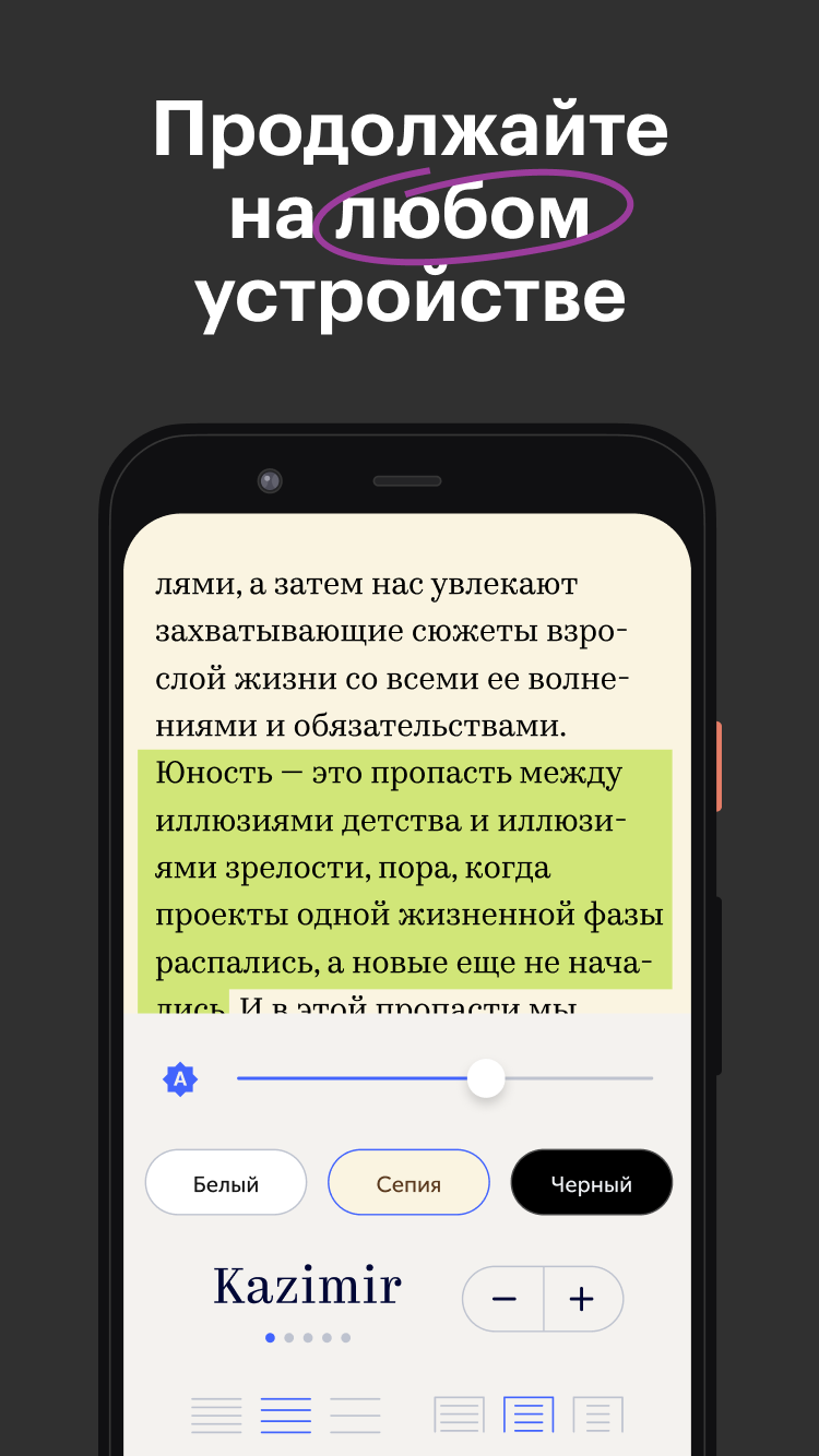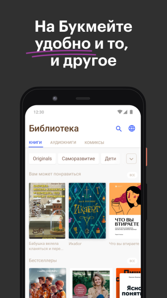 Данная платформа является самым крупным русскоязычным сервисом с электронными книгами, подкастами и аудиокнигами. В рамках одного приложения вы сможете читать произведения, слушать контент и просматривать новости мира литературы. Вам не потребуется отдельно установленная «читалка» и проигрыватель для аудиокниг – все инструменты уже имеются в программе. Библиотека собрана из тысяч позиций разных жанров – от комиксов до научных книг и иностранной литературы в оригинале. Если нет времени вдумчиво читать – включайте озвученные произведения, которых ненамного меньше текстовых. Также на площадке Букмейт доступны сотни подкастов от постоянных авторов. Вы всегда будете обеспечены интересным, познавательным и веселым контентом дома, в дороге, на работе или во время спортивных занятий.