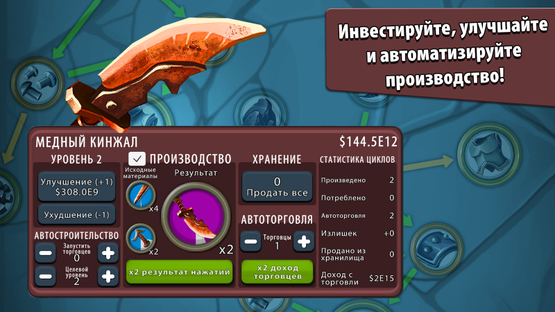 Геймеры могут открыть большое разнообразие различных материалов, например, кожу, металлы, руду, драгоценные камни и ткани. Если их объединить, кликая по экрану, то можно получить товары уже готовые к продаже. Нужно регулярно стараться улучшать качество производимых предметов, чтобы и доход был значительно выше. Также необходимо наладить внушительные производственные цепочки, которые позволят очень быстро заработать приличную сумму денег. Взломанная версия позволит использовать активное увеличение скорости х10 и множитель продажи х50.